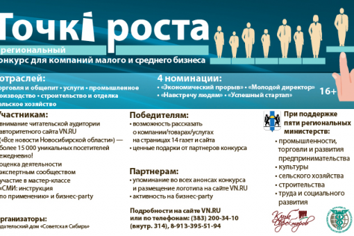 II Региональный конкурс информационной поддержки и поощрения предприятий малого и среднего бизнеса «Точкi роста-2018» набирает обороты. В этом году конкурс проходит более масштабно – его поддержали сразу пять министерств: министерство промышленности, торговли и развития предпринимательства, министерство сельского хозяйства, министерство строительства, министерство культуры, министерство труда и социального развития Новосибирской области и Торгово-Промышленная палата НСО.