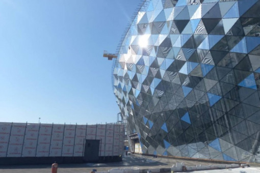 На новой ледовой арене монтируют эксплуатируемую кровлю – стилобат. С территории вывозят строительные вагончики, площадка освобождается от материалов.