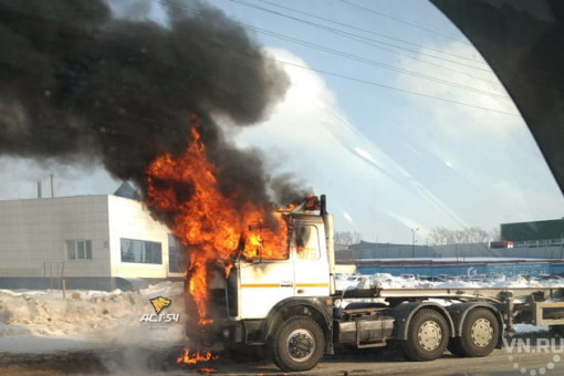 Огонь полностью охватил кабину длинномера МАЗ в Калининском районе Новосибирска. Водитель успел покинуть машину, но получил ожоги.