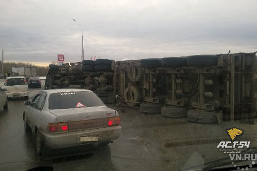 Тягач с прицепом занесло рядом с поселком Красный Восток Новосибирского района. Тяжелая машина опрокинулась набок, из кузова высыпался груз. Водитель грузовика госпитализирован.