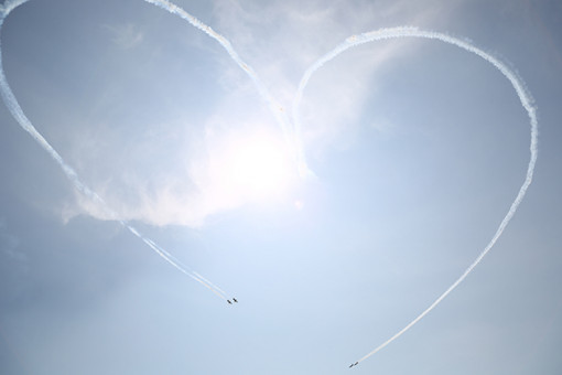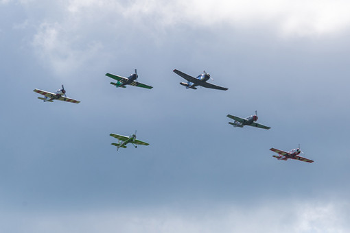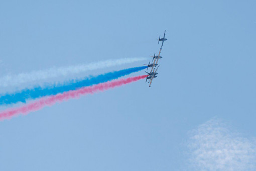 Пилотажная группа «Барсы», шесть отважных девушек из Сургута на самолетах «Як» исполнили групповые фигуры высшего пилотажа над аэродромом Мочище. Самолеты оставляют за собой полосы дыма в небе и проносятся над головами зрителей в десяти метрах.