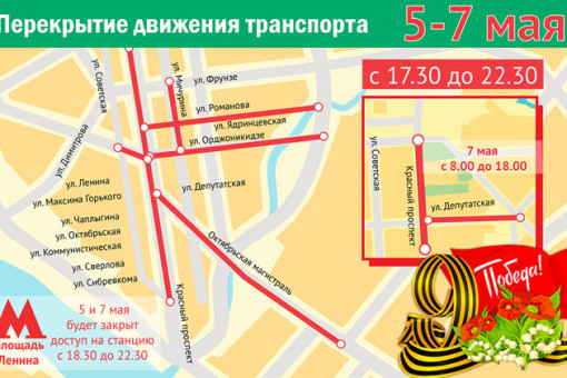 Праздничные мероприятия в День Победы-2021 станут причиной перекрытия ряда дорог и Октябрьского моста в Новосибирске. Ограничение движения коснется как автомобилистов, так и общественного транспорта. Рассказываем, как изменятся маршруты общественного транспорта 9 мая.