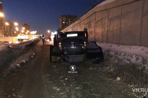 Девушка-водитель перевернула свой автомобиль, двигаясь по подъему с Ипподромской магистрали на улицу Гоголя в Новосибирске. Предварительно машина залетела в сугроб.