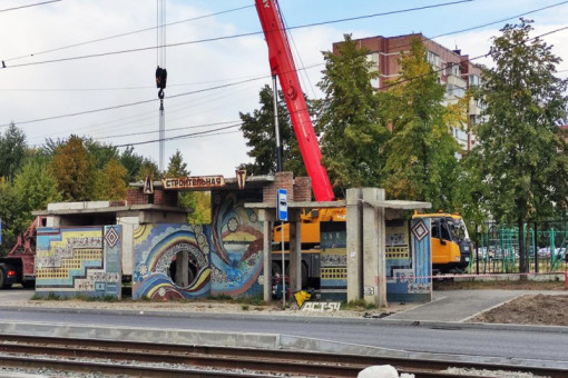 Строительный кран разбирает старый советский остановочный павильон на улице Мира. Весной 2025 года мозаичную остановку отказались включить в реестр выявленных объектов культурного наследия.